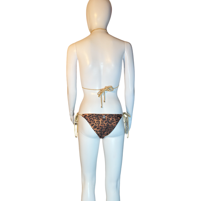 The Safari Luxe bikini features a striking leopard print accented with handcrafted leather fringe details, evoking the free-spirited essence of bohemian elegance.